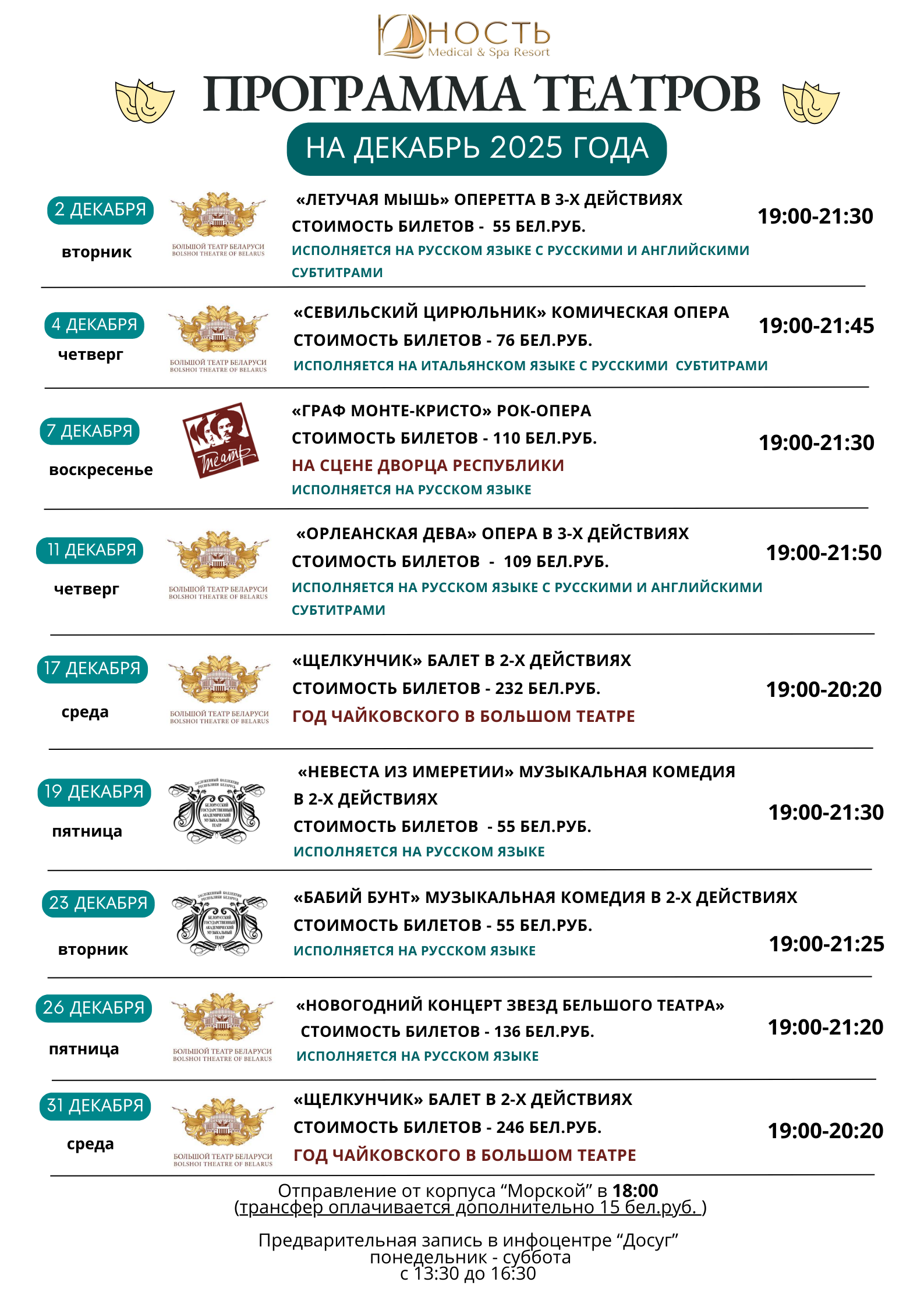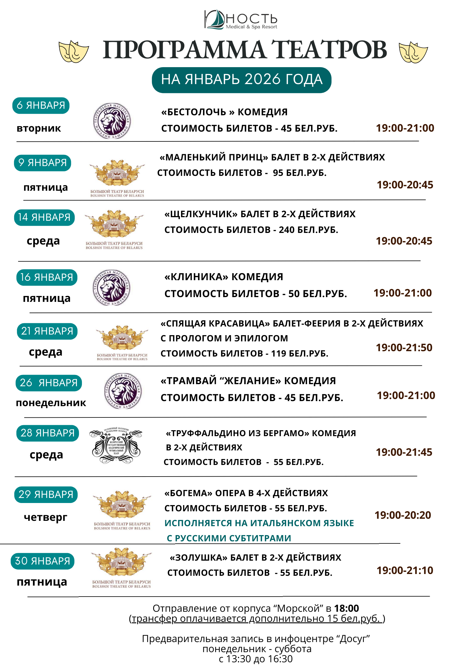 В санатории "Юность" для Отдыхающих еженедельно организовываются театральные поездки.