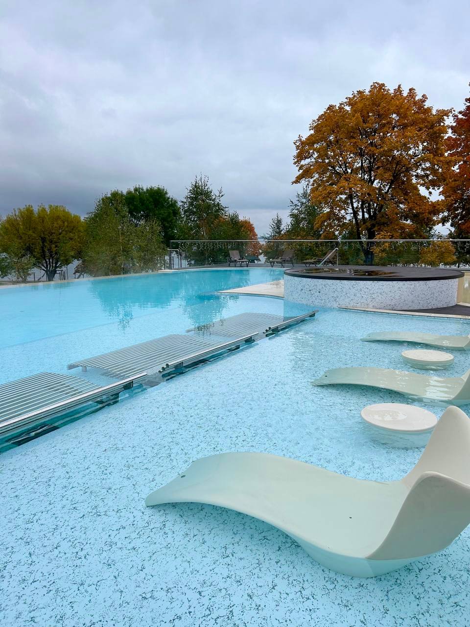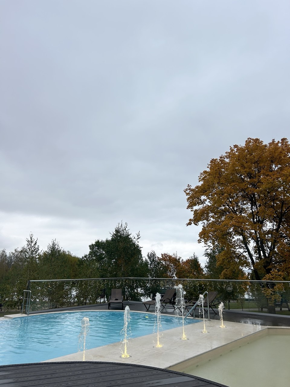 Вечером пространство преображается благодаря красивой подсветке и шести фонтанам, которые создают атмосферу уюта и спокойствия, подчеркивая природную красоту окружающего ландшафта. Новый бассейн стал не только местом для активного отдыха, но и идеальным уголком для релаксации и общения в санатории «Юность».