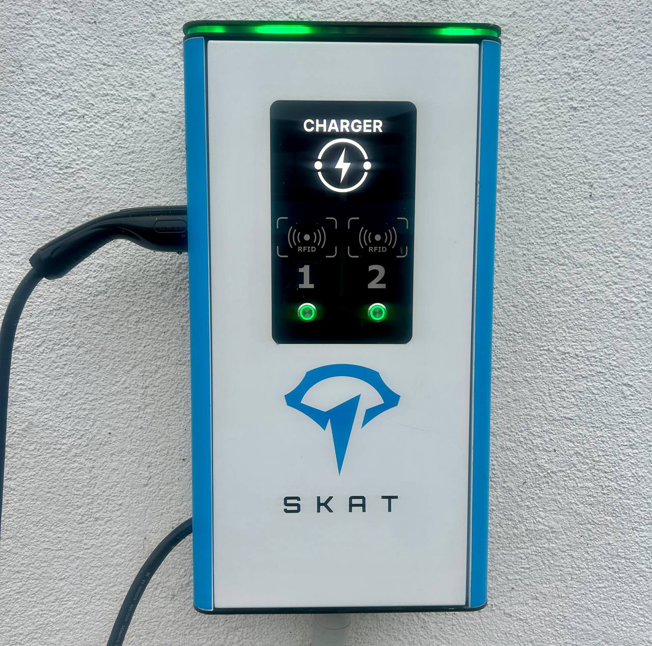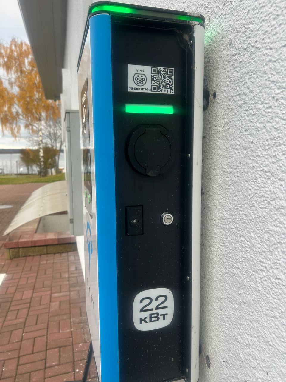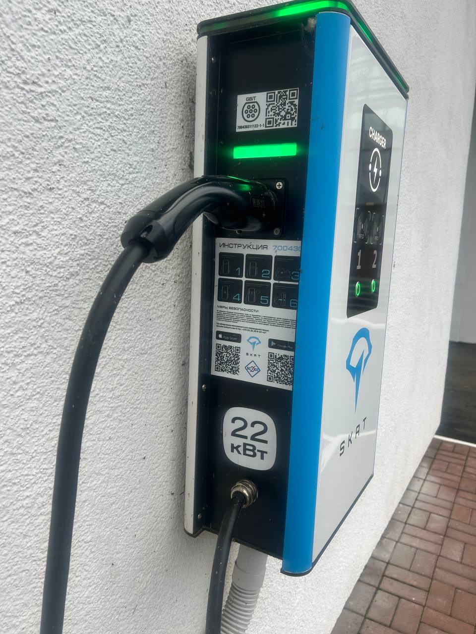 Зарядная станция SKAT, мощность 22 кВт, стандарт зарядки Type2 и GB/T. Чтобы начать зарядку, необходимо скачать приложение (по QR коду) или зайти на сайт.