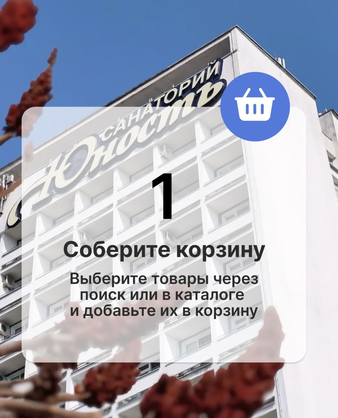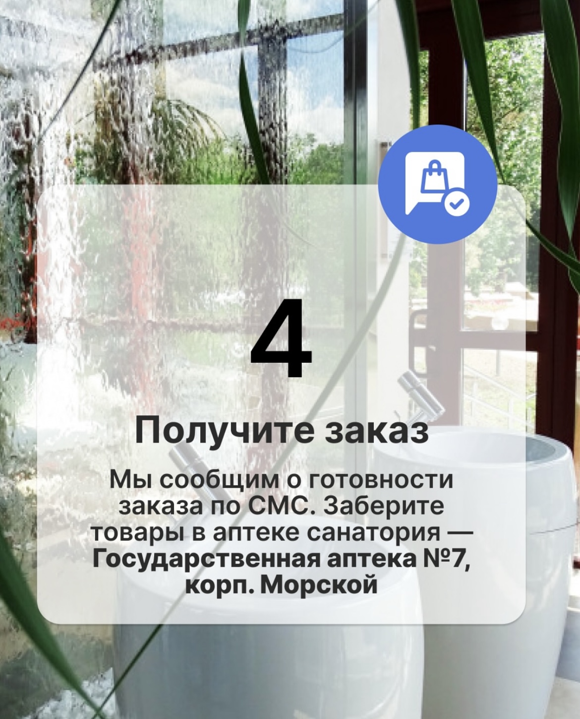 Оформляйте заказ онлайн в любое удобное для вас время. Ваши покупки будут доставлены прямо в аптеку «Государственная аптека №7» в санатории, где вы сможете их забрать.