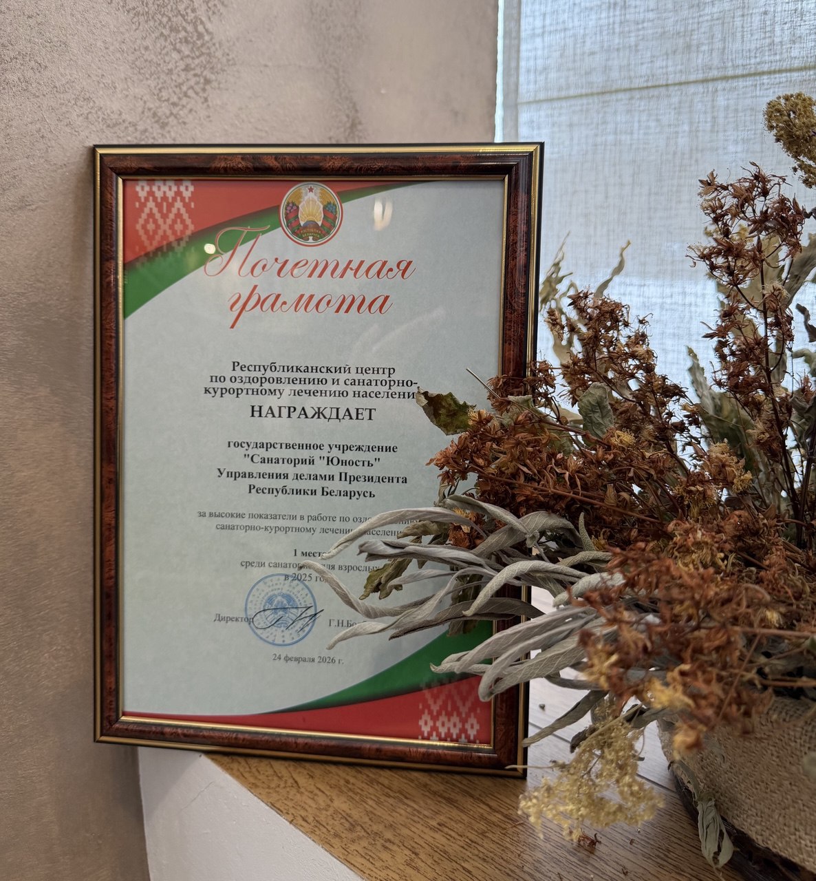 По итогам 2025 года государственное учреждение «Санаторий «Юность» Управления делами Президента Республики Беларусь удостоено Почетной грамоты и заняло первое место в номинации «Лучший санаторий для взрослых» – за высокие показатели в работе по оздоровлению и санаторно-курортному лечению населения.