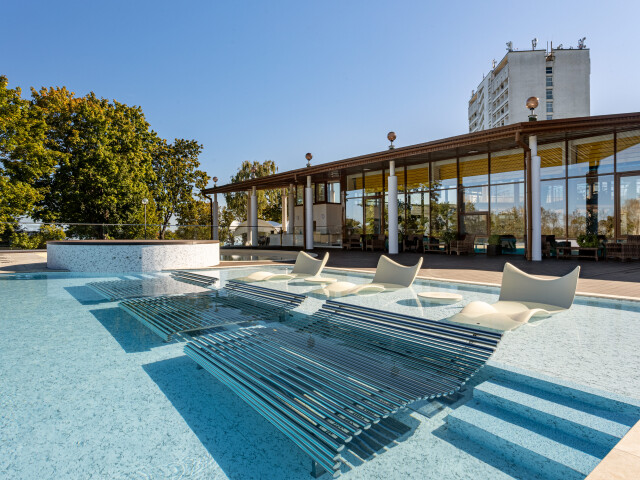 Круглогодичный подогреваемый открытый бассейн включает несколько зон отдыха: